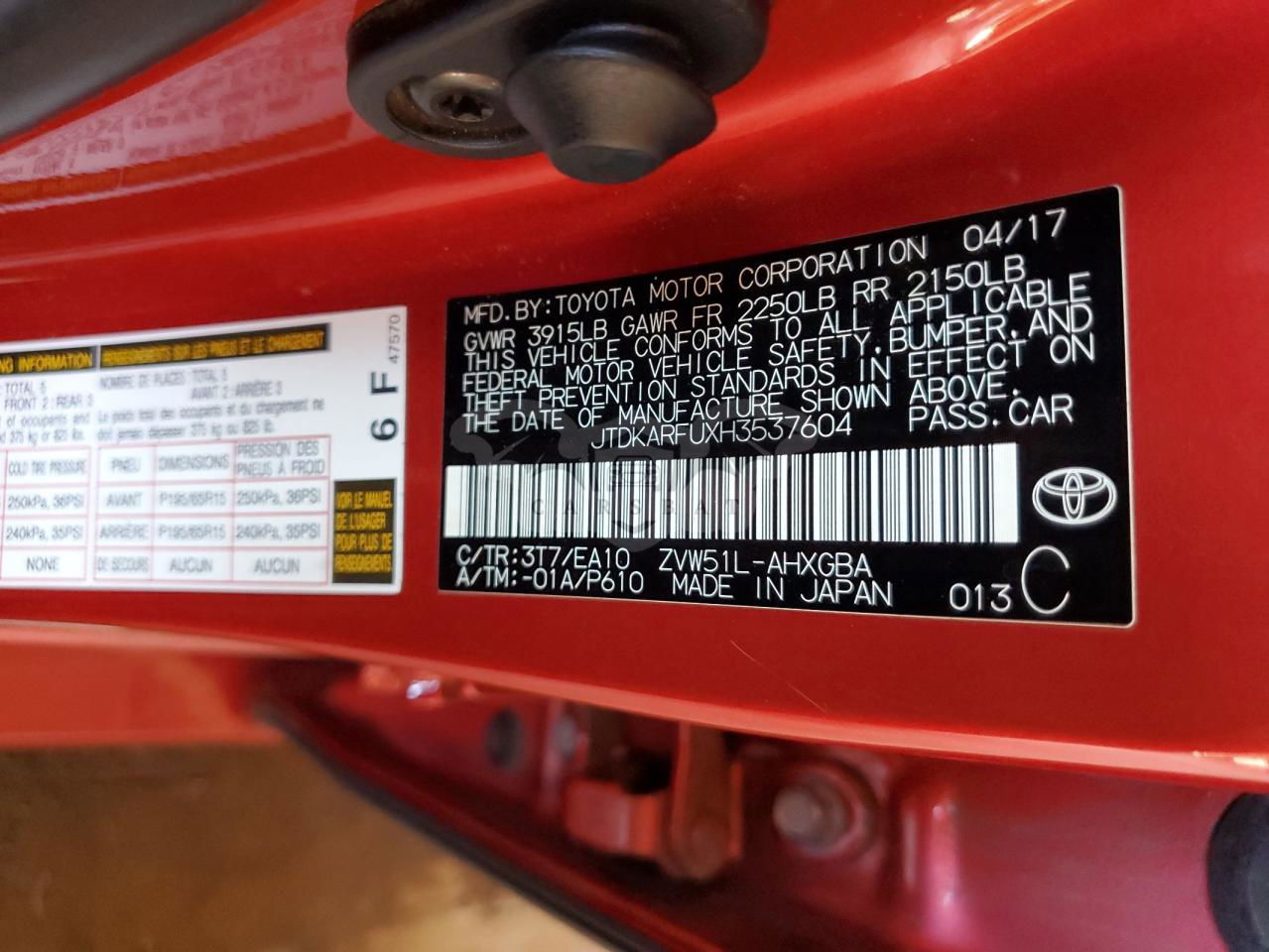 • VIN: JTDKARFUXH3537604