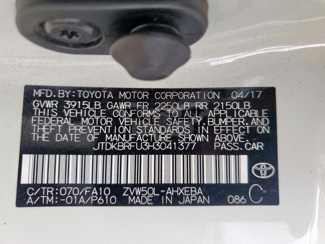 • VIN: JTDKBRFU3H3041377