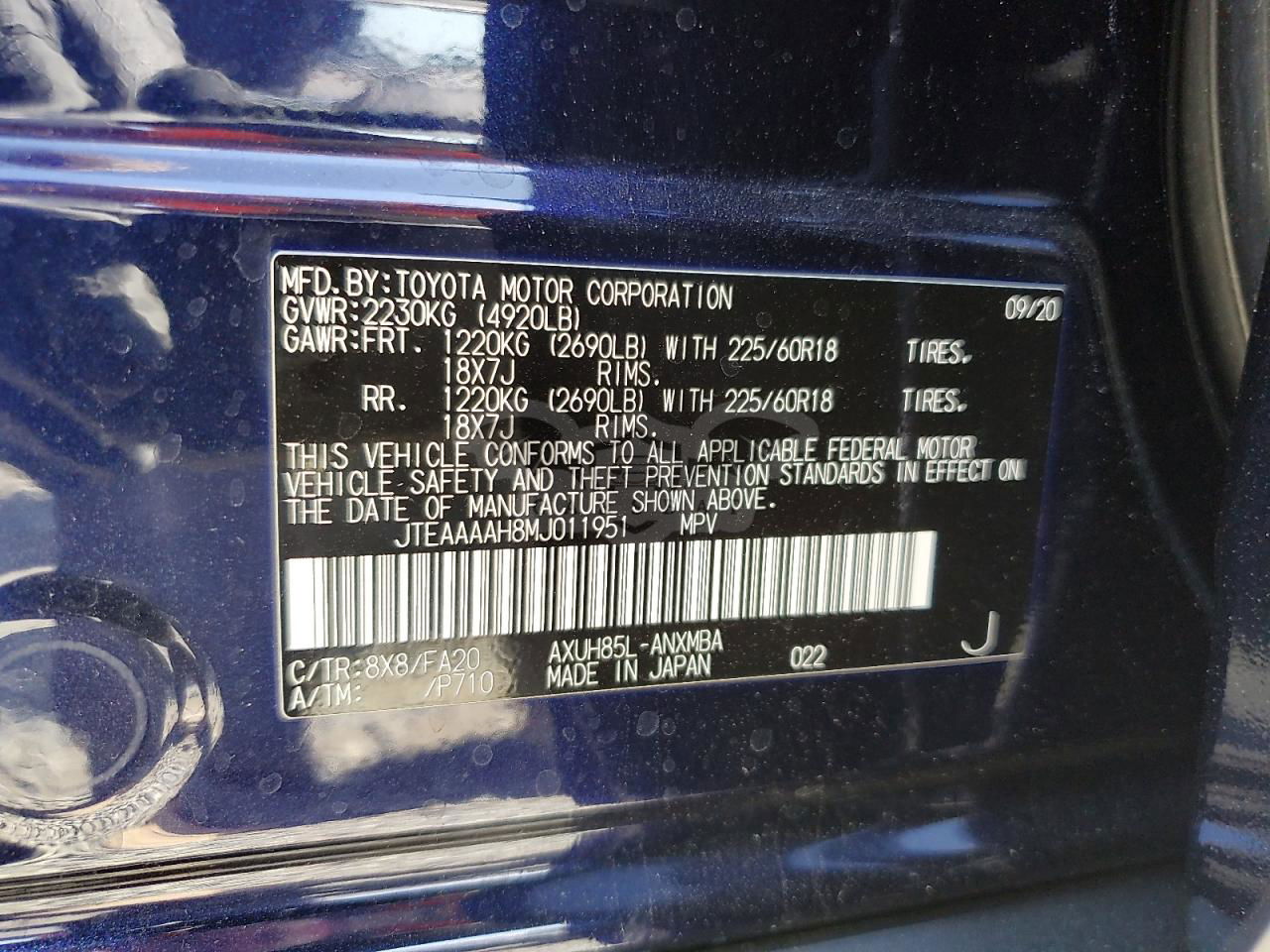 • VIN: JTEAAAAH8MJ011951