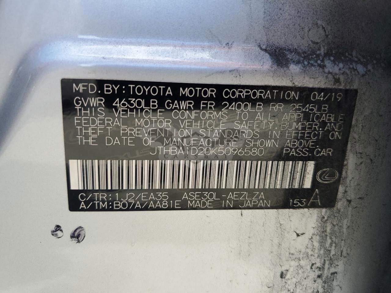 • VIN: JTHBA1D20K5096580