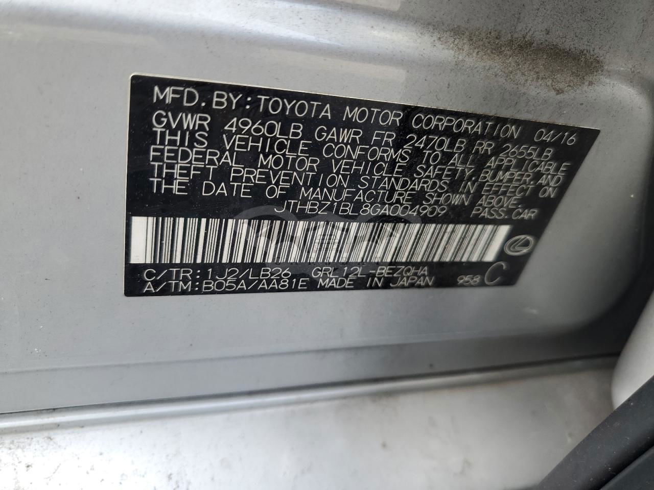 • VIN: JTHBZ1BL8GA004909