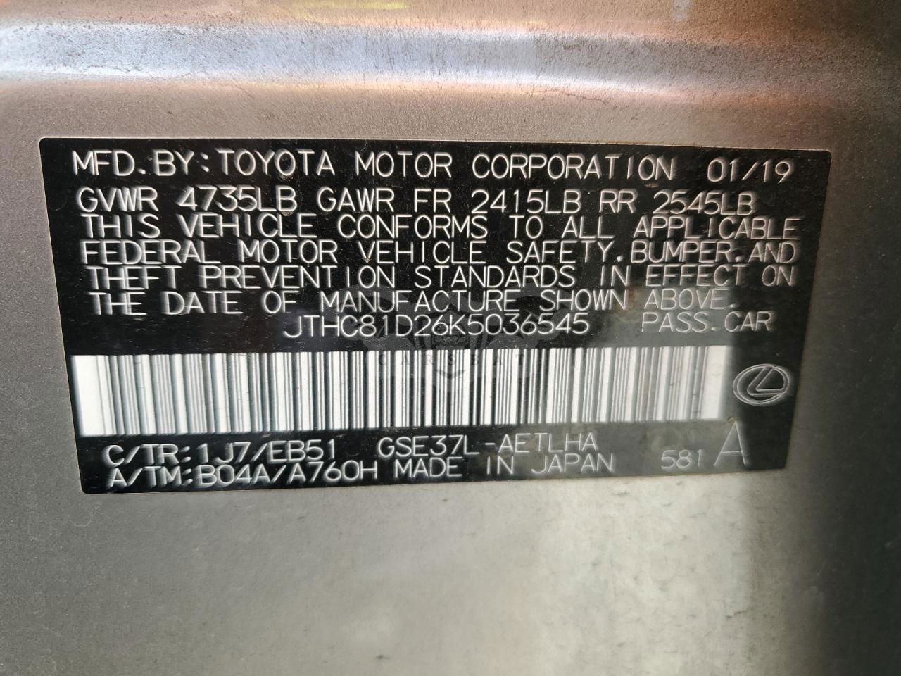 • VIN: JTHC81D26K5036545