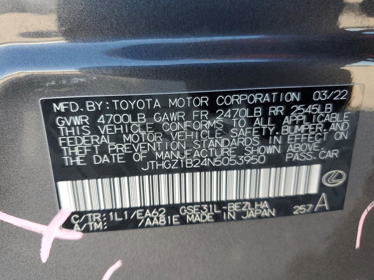 • VIN: JTHGZ1B24N5053950