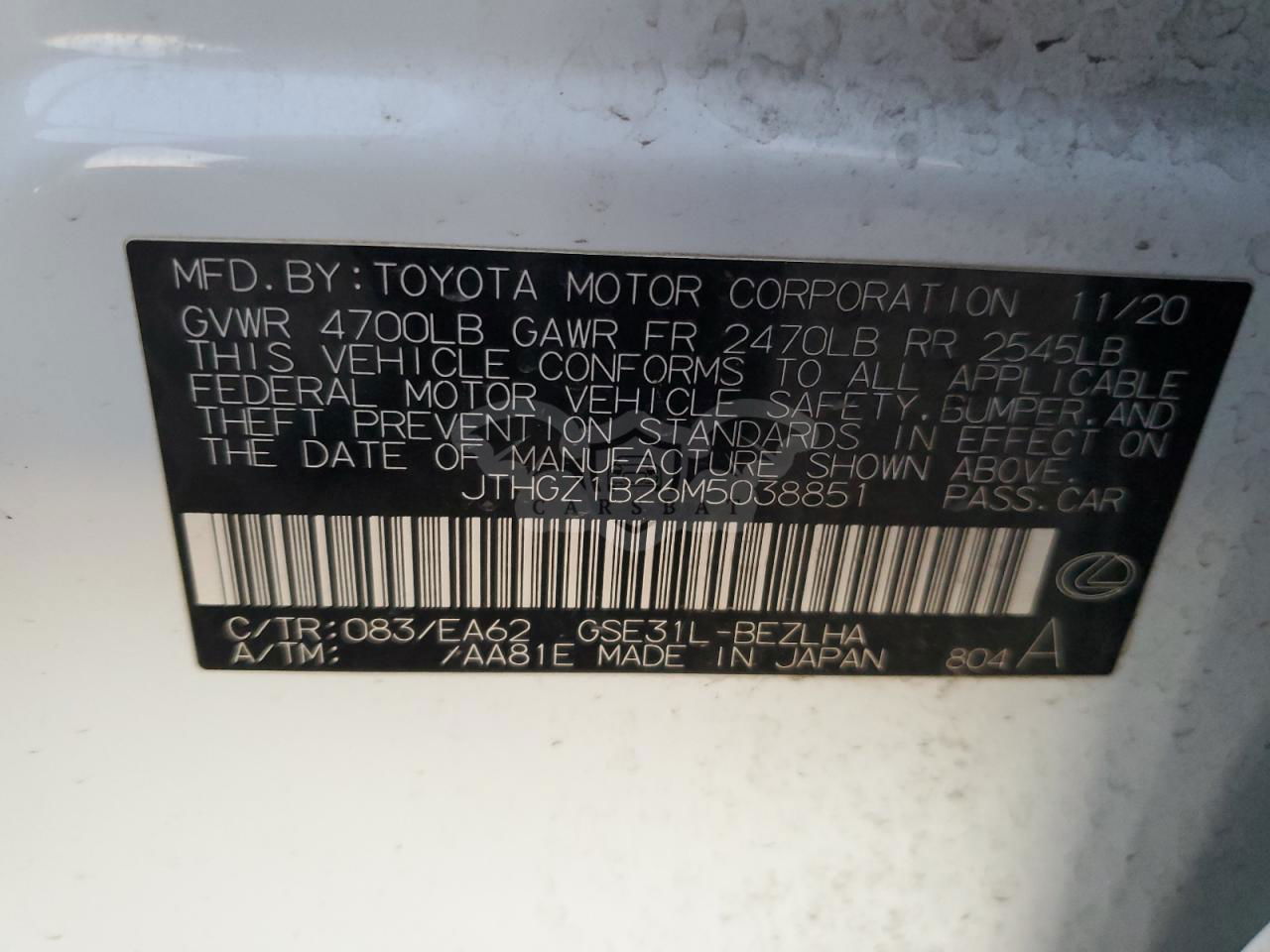 • VIN: JTHGZ1B26M5038851