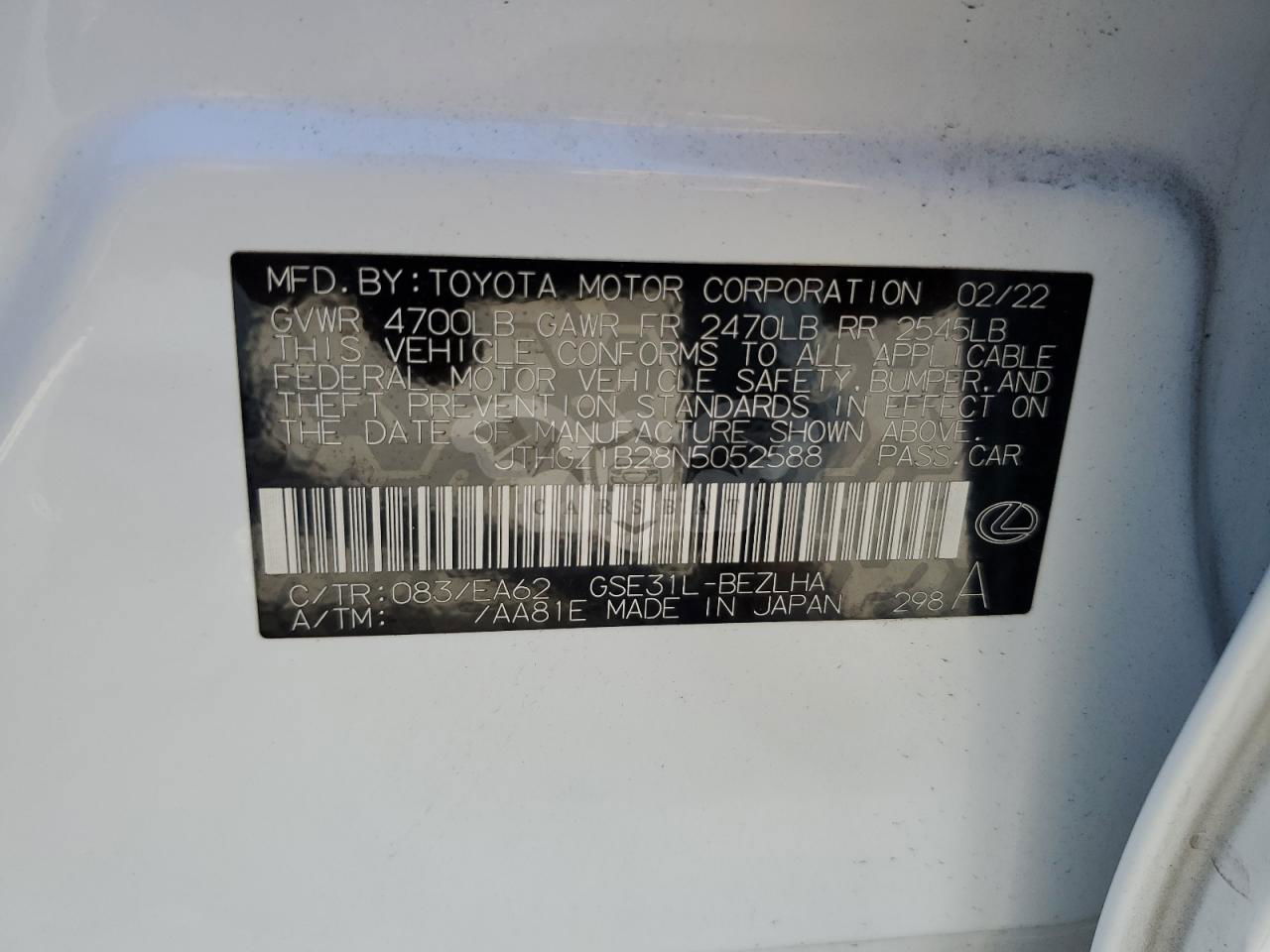 • VIN: JTHGZ1B28N5052588