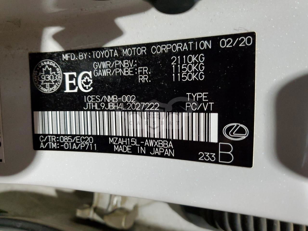 • VIN: JTHL9JBH4L2027222