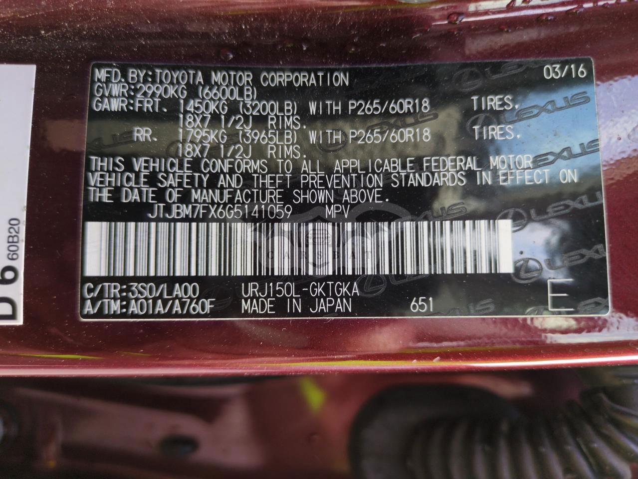 • VIN: JTJBM7FX6G5141059