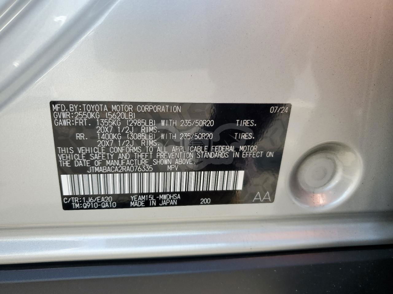 • VIN: JTMABACA2RA076335