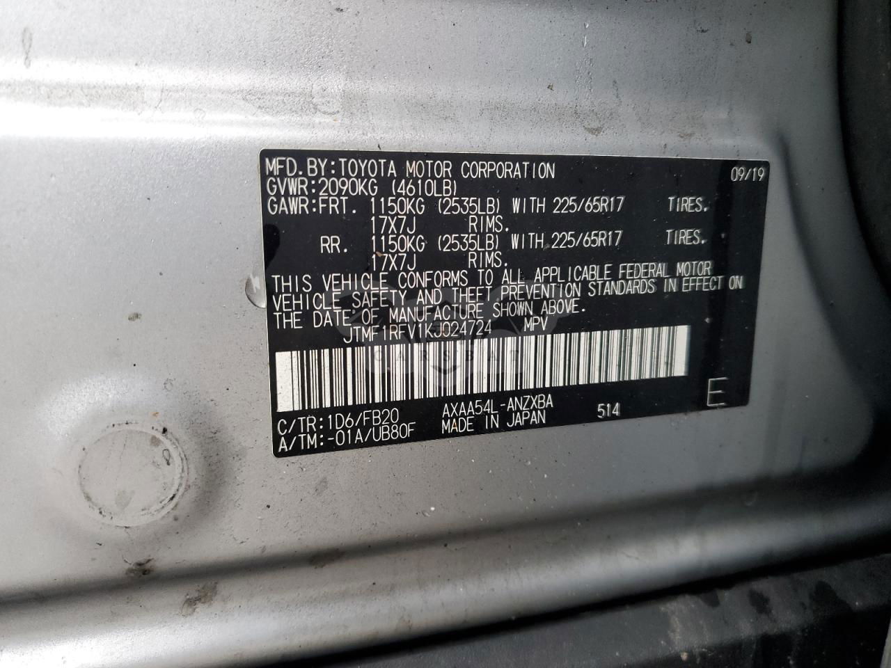 • VIN: JTMF1RFV1KJ024724