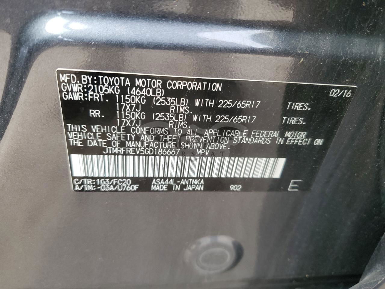 • VIN: JTMRFREV5GD186667