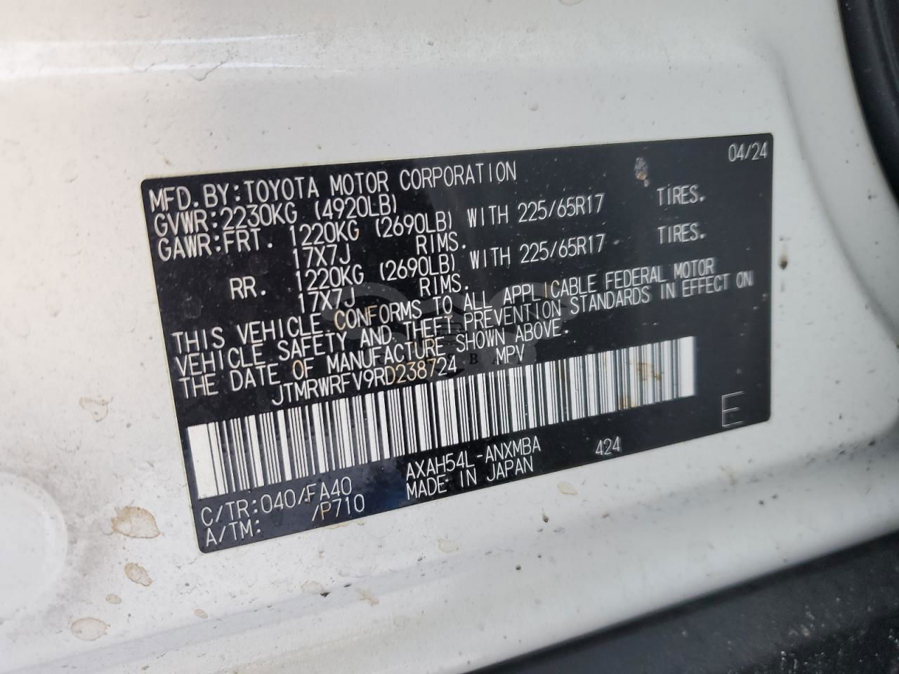 • VIN: JTMRWRFV9RD238724