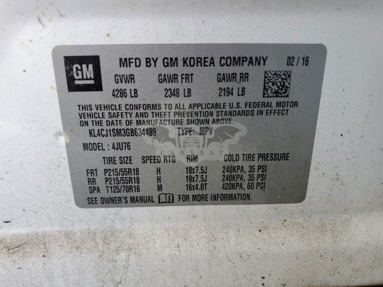 • VIN: KL4CJ1SM3GB634489