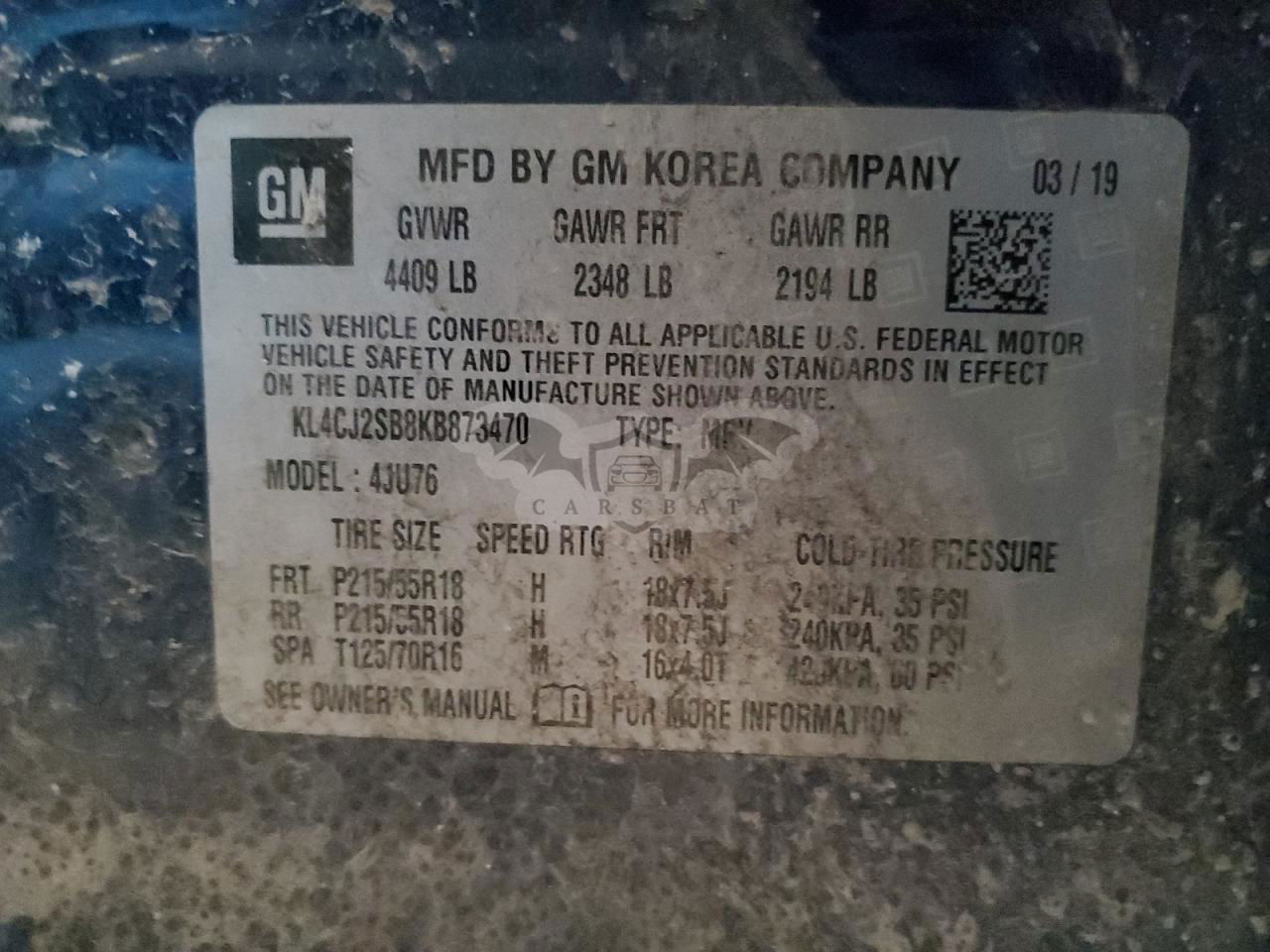 • VIN: KL4CJ2SB8KB873470