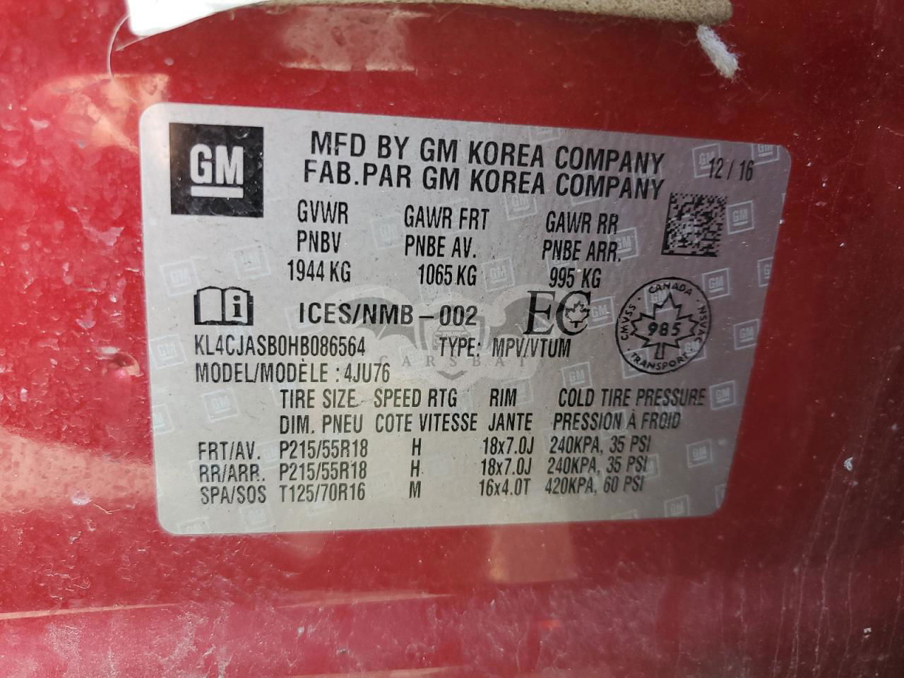 • VIN: KL4CJASB0HB086564