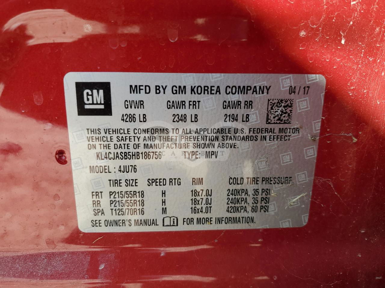 • VIN: KL4CJASB5HB186756