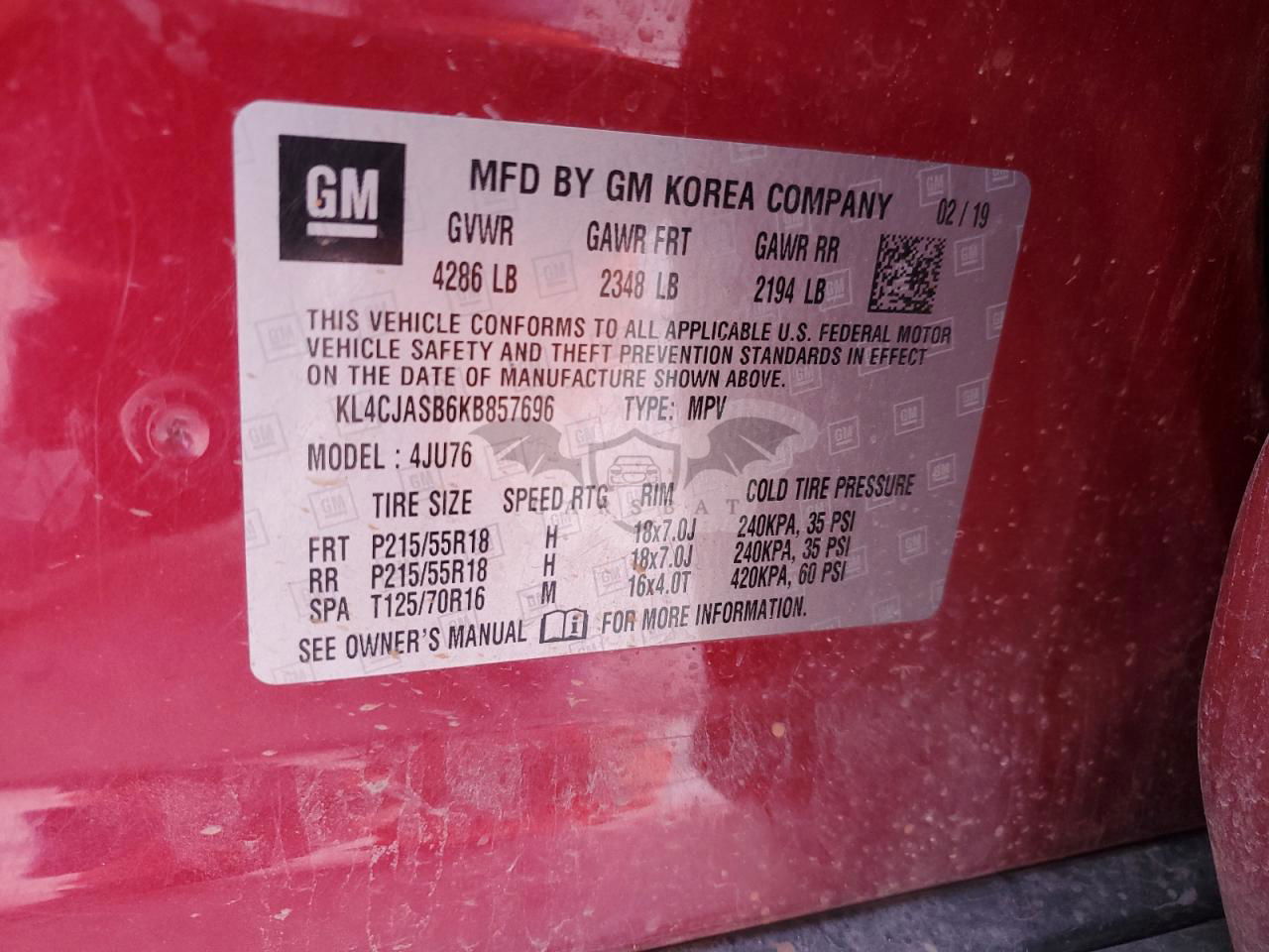 • VIN: KL4CJASB6KB857696