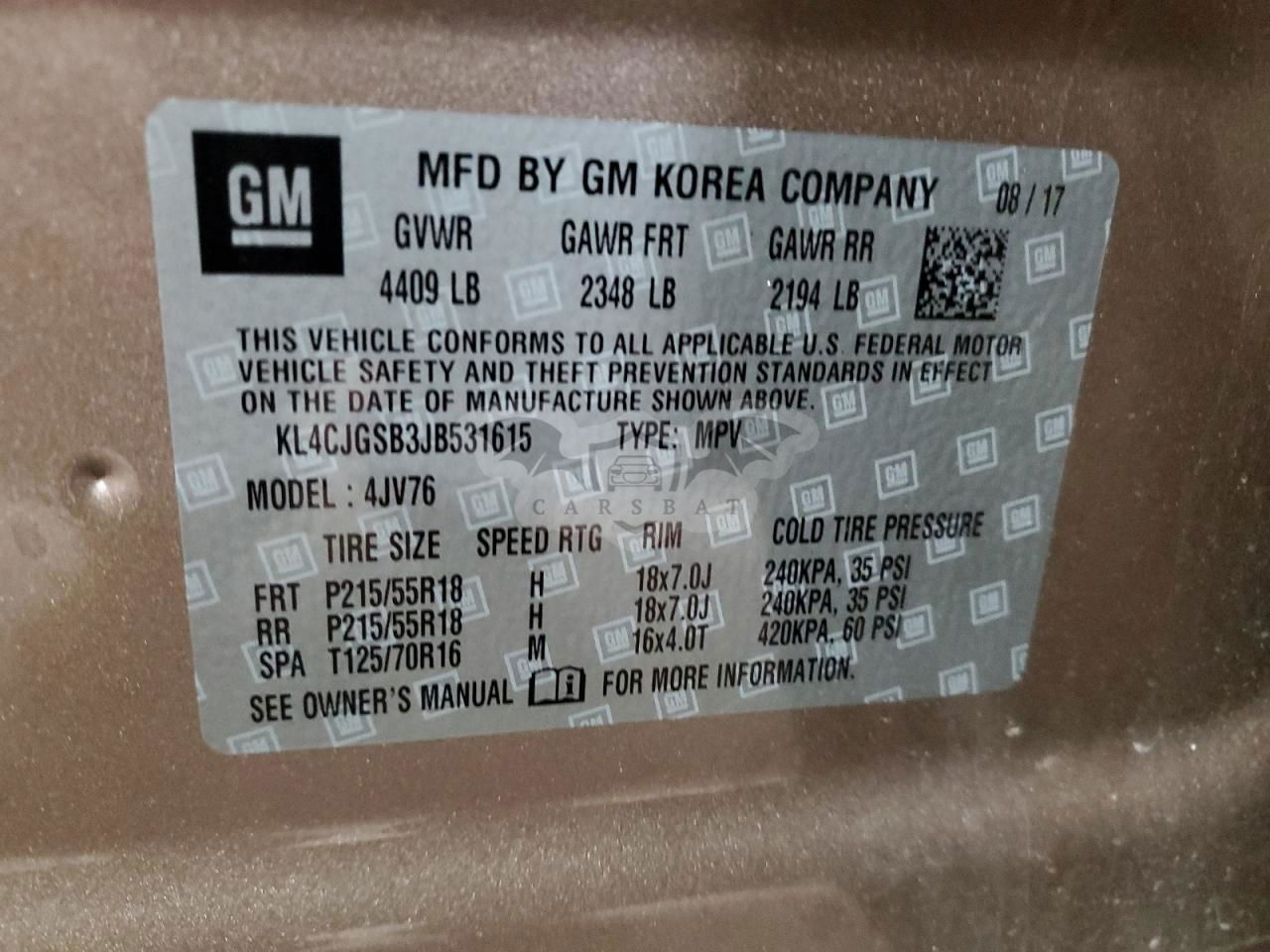 • VIN: KL4CJGSB3JB531615