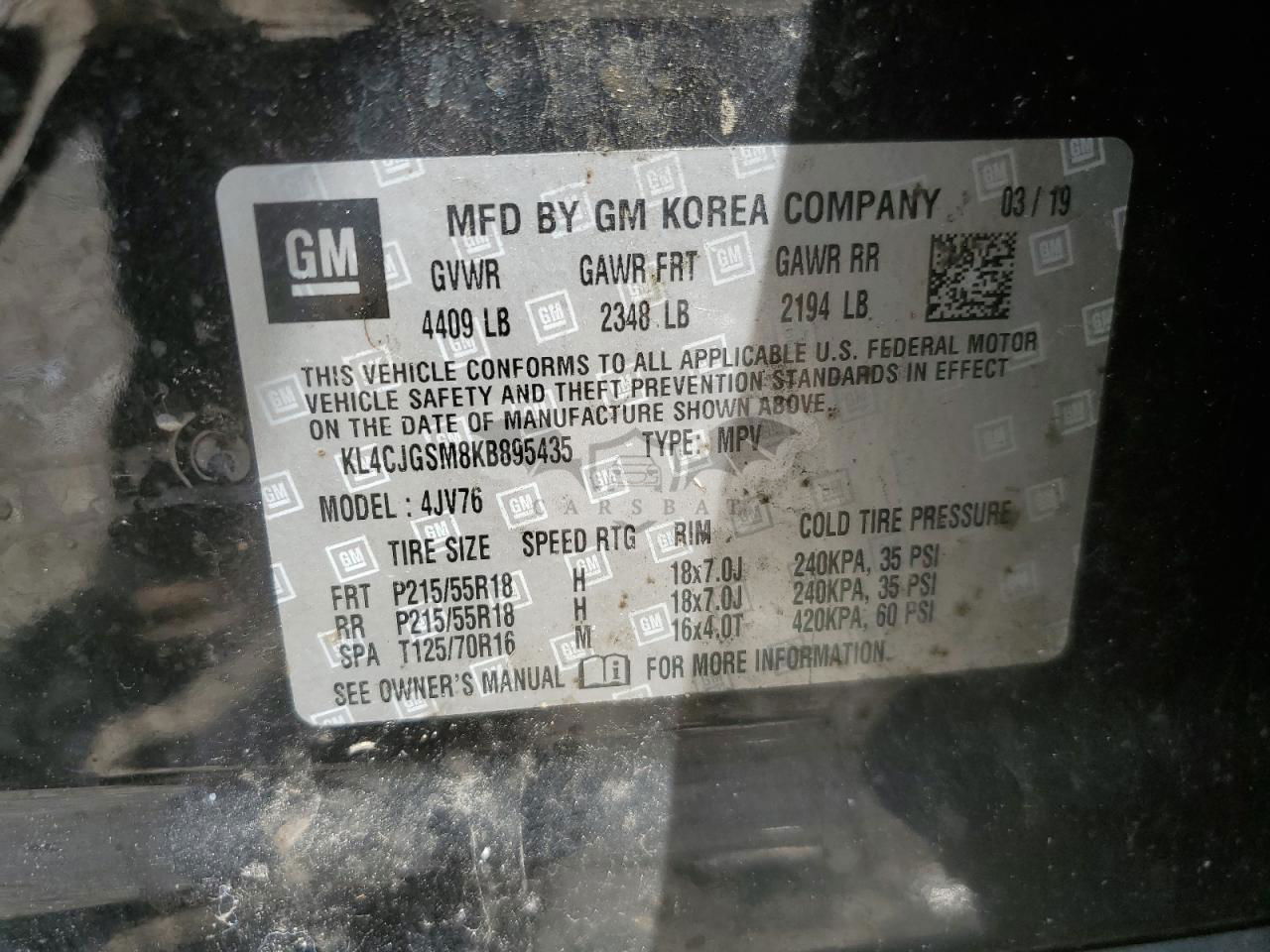 • VIN: KL4CJGSM8KB895435
