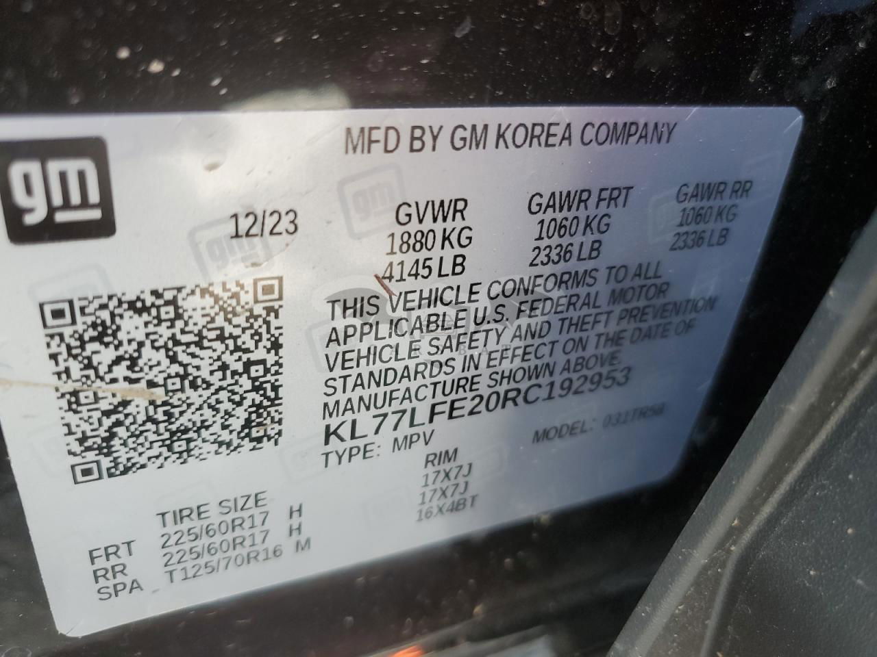 • VIN: KL77LFE20RC192953