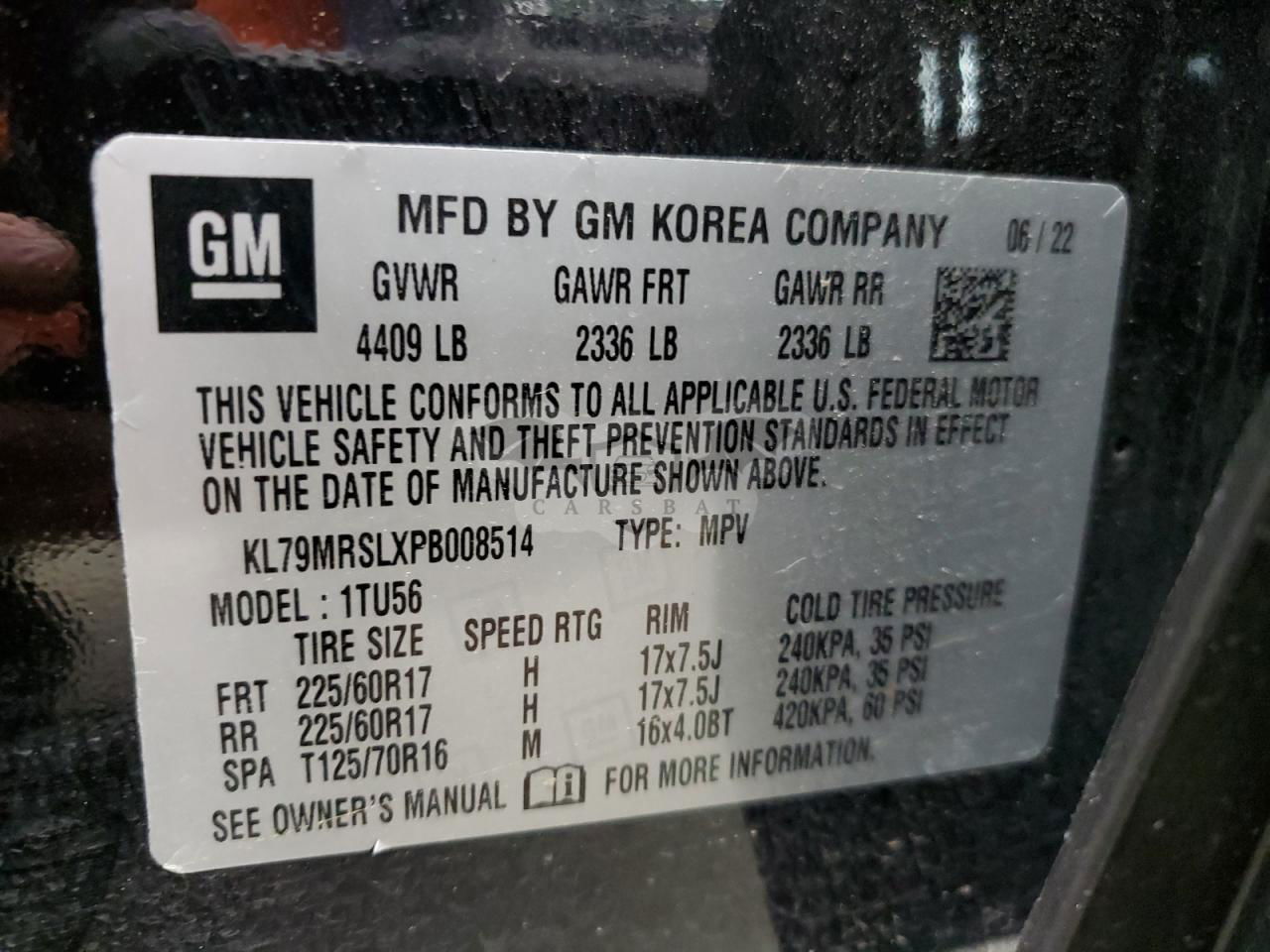• VIN: KL79MRSLXPB008514