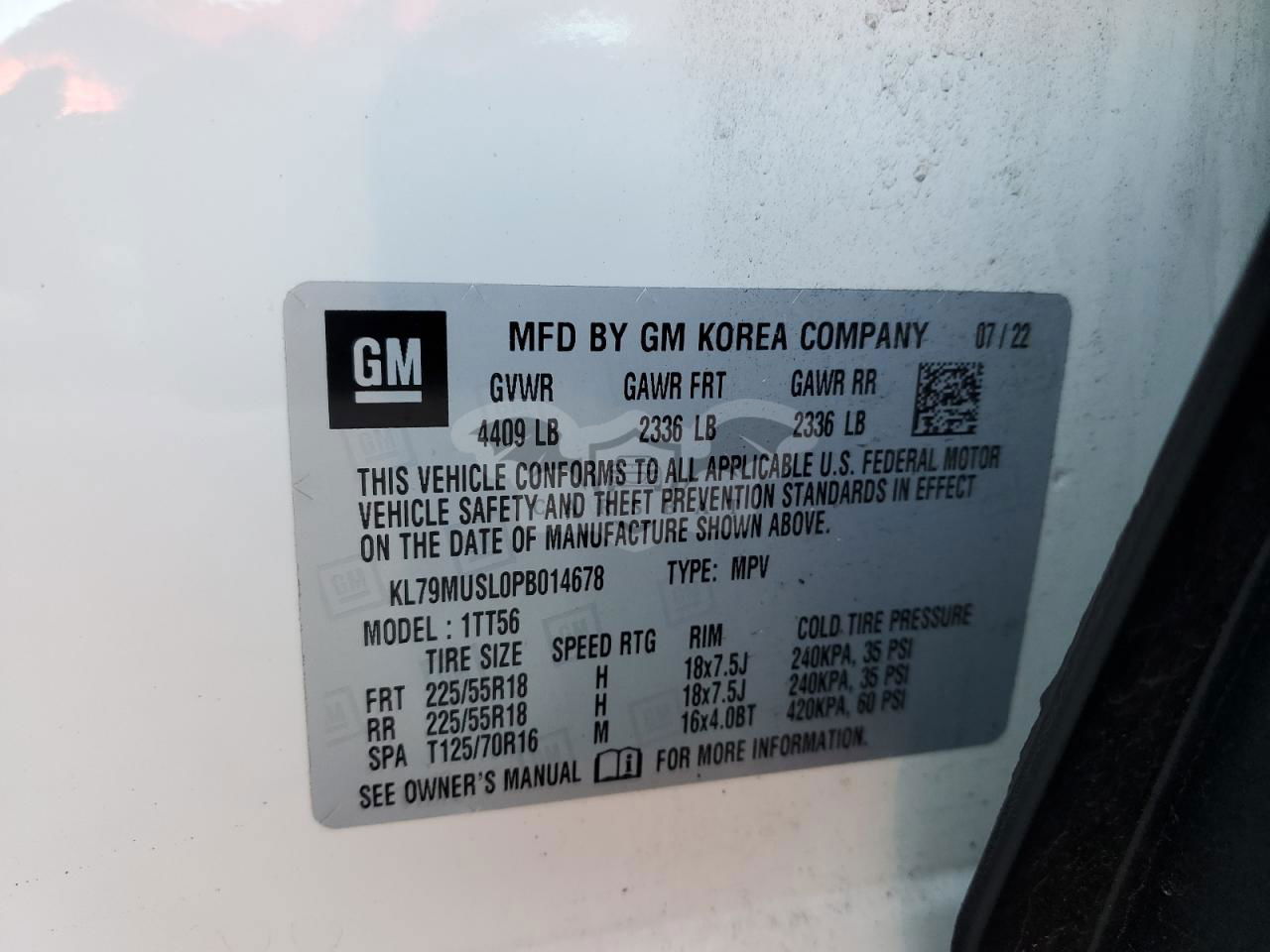 • VIN: KL79MUSL0PB014678