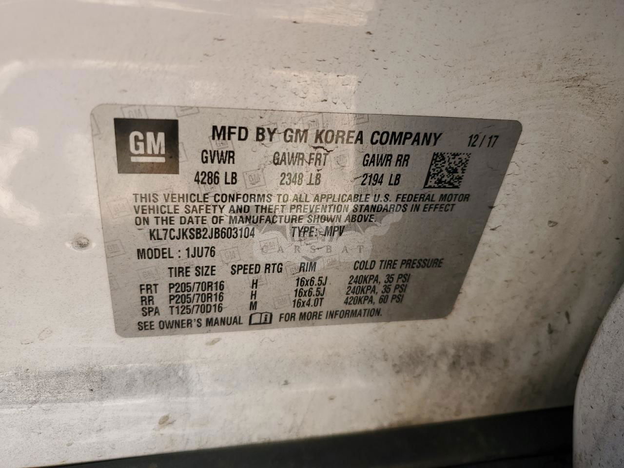 • VIN: KL7CJKSB2JB603104
