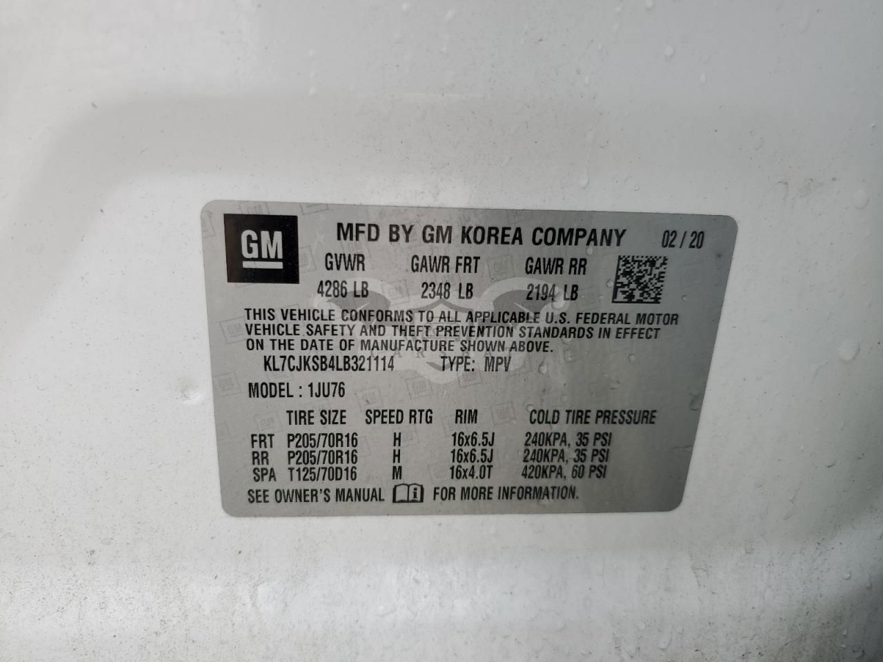 • VIN: KL7CJKSB4LB321114