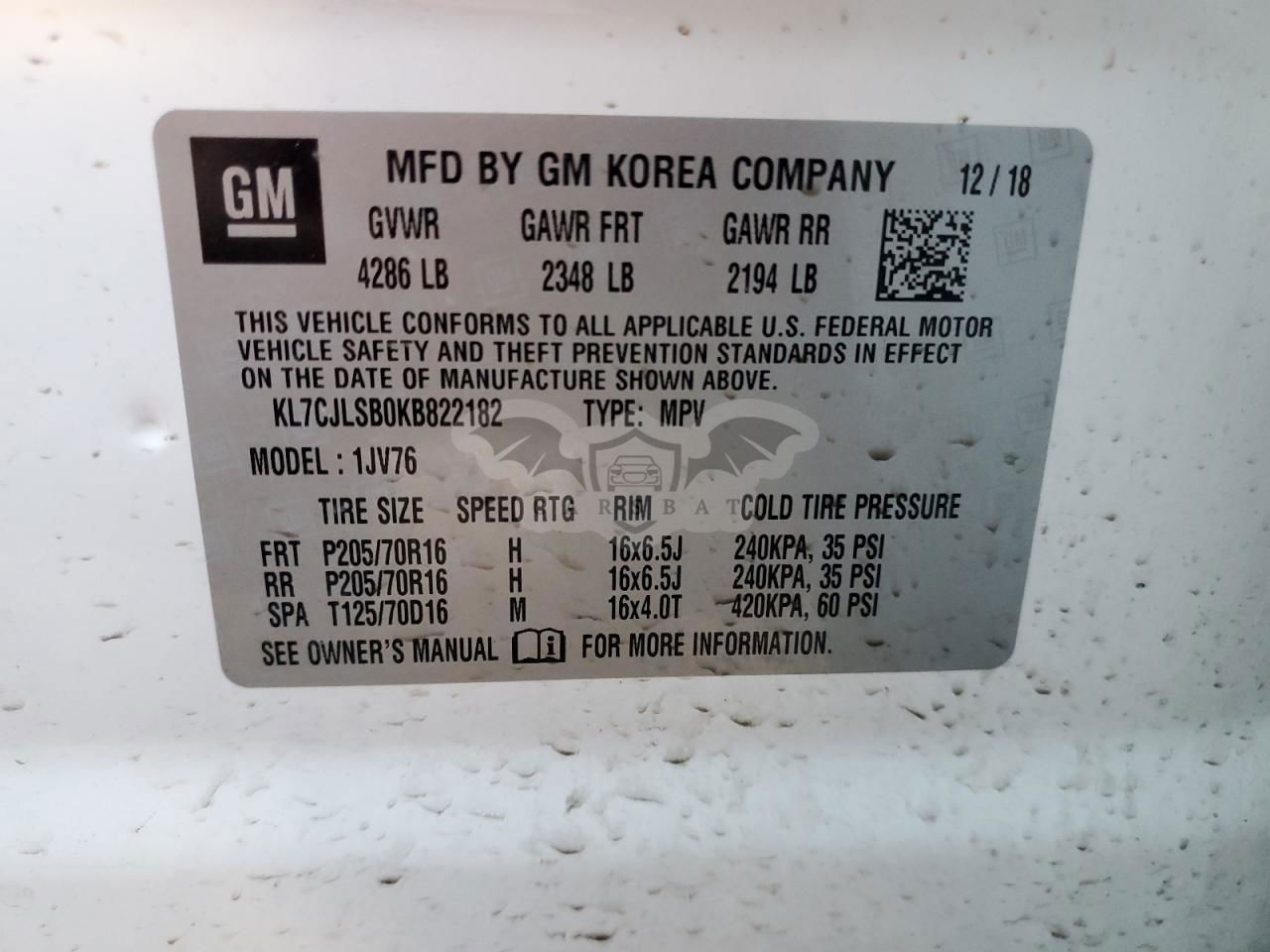 • VIN: KL7CJLSB0KB822182