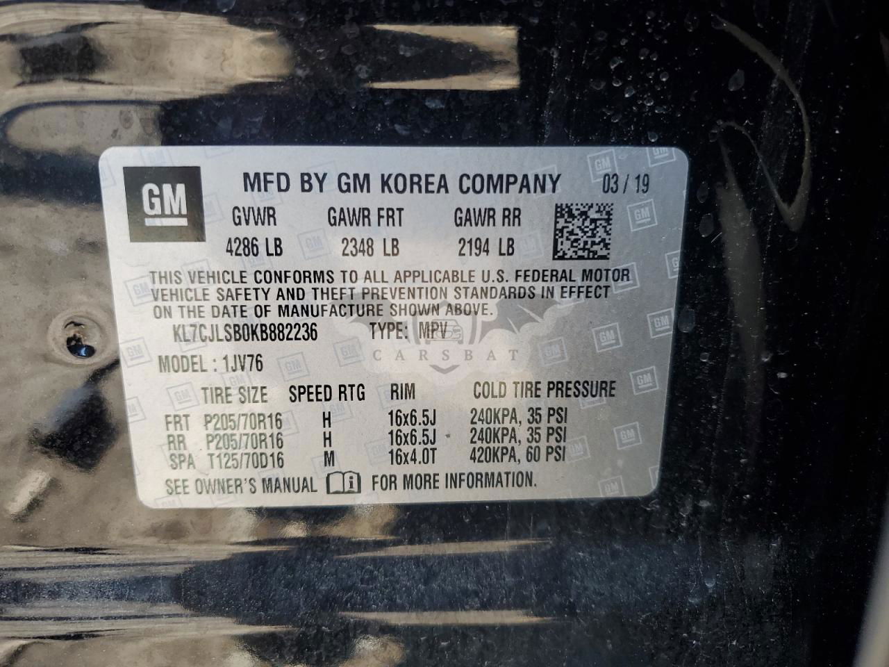 • VIN: KL7CJLSB0KB882236