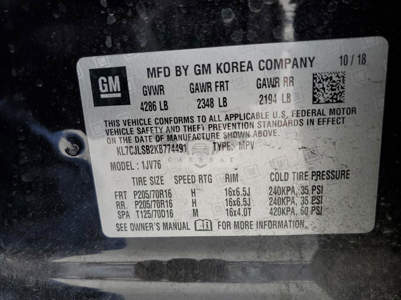 • VIN: KL7CJLSB2KB774491