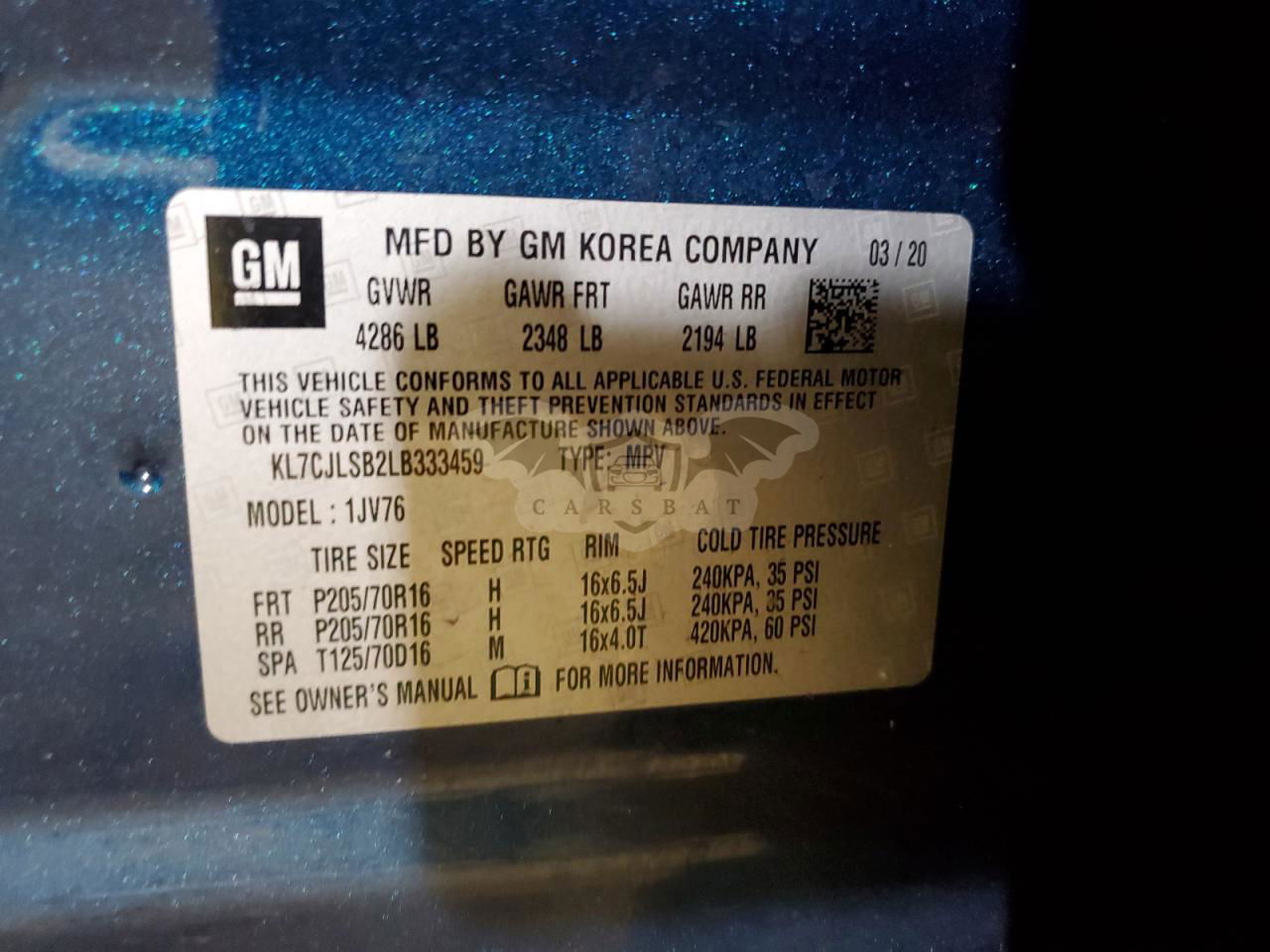 • VIN: KL7CJLSB2LB333459
