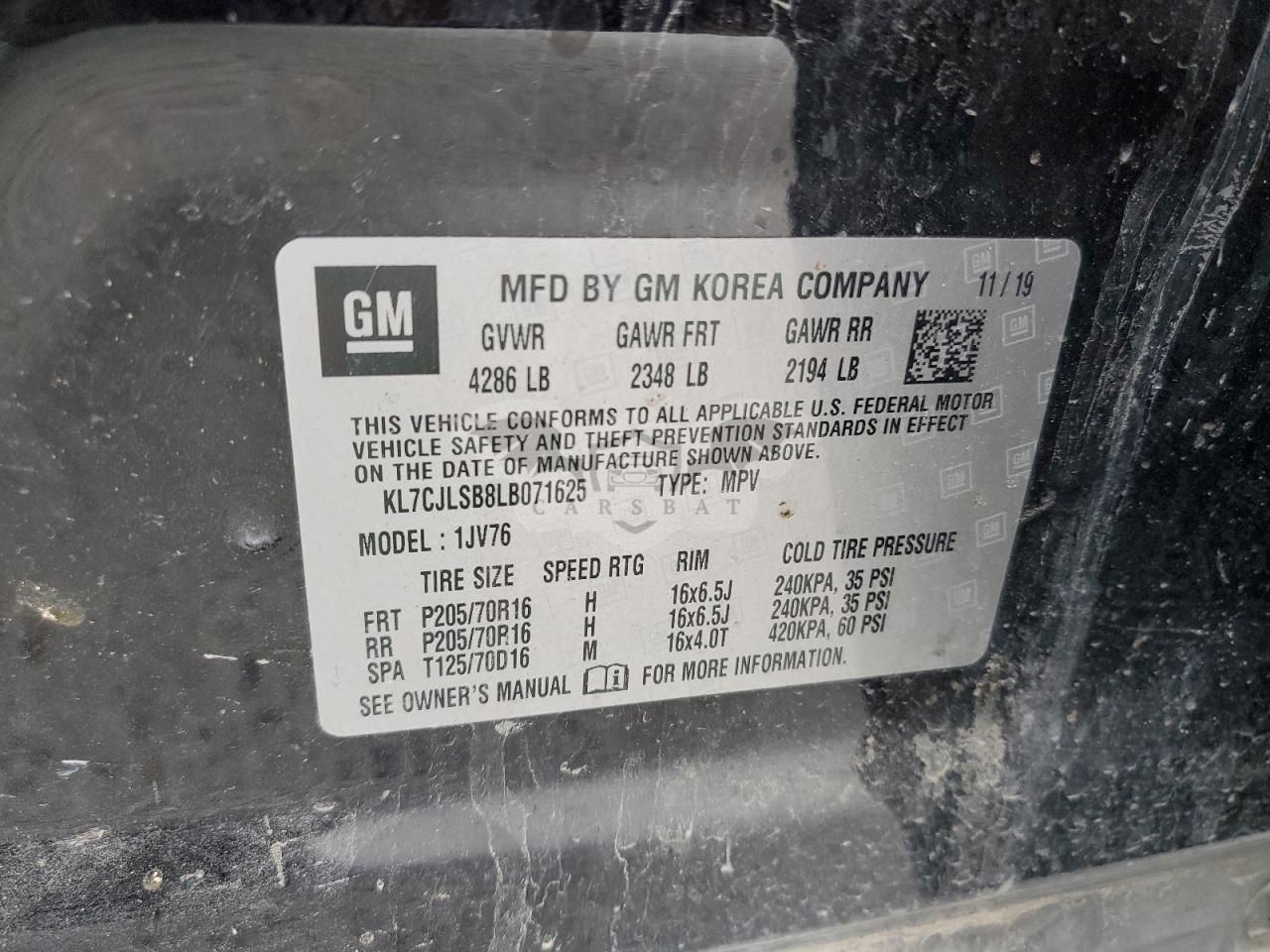 • VIN: KL7CJLSB8LB071625
