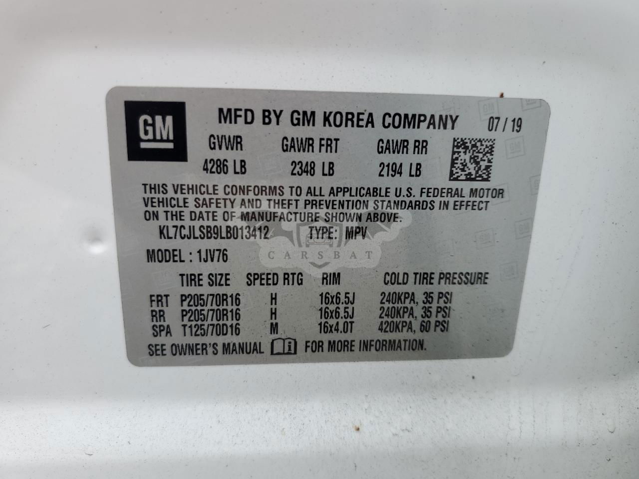 • VIN: KL7CJLSB9LB013412