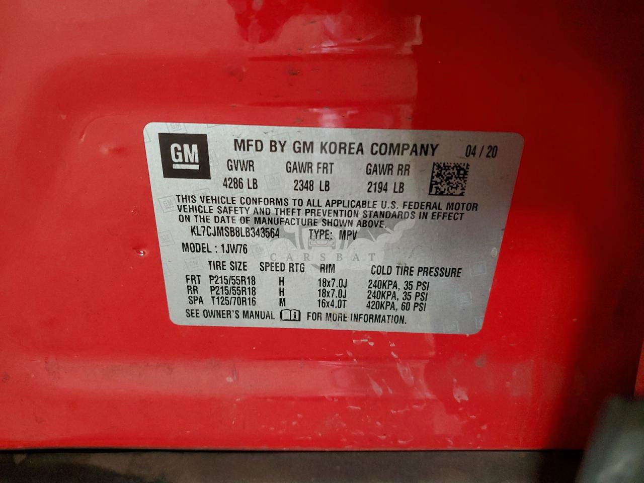• VIN: KL7CJMSB8LB343564