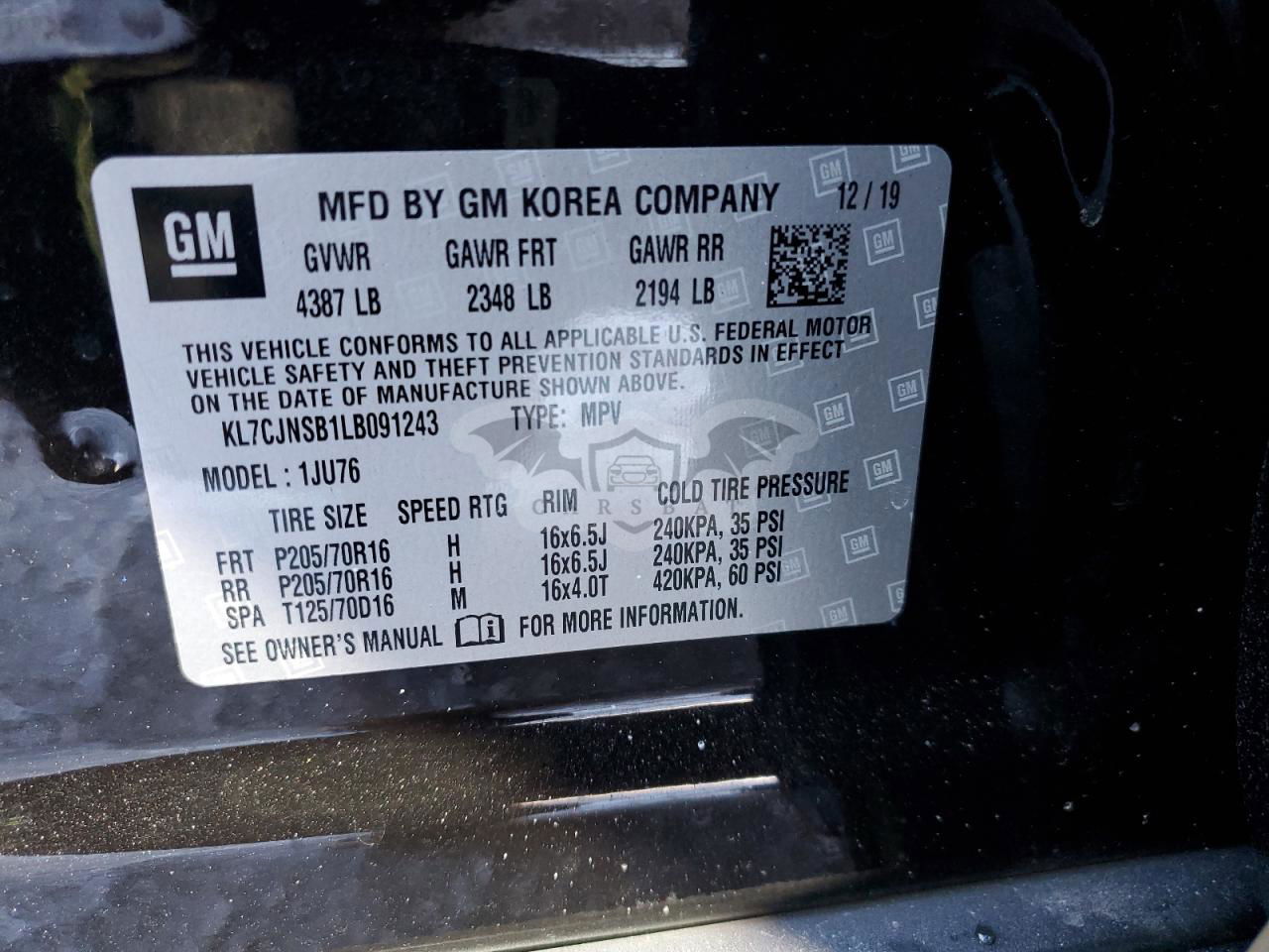 • VIN: KL7CJNSB1LB091243