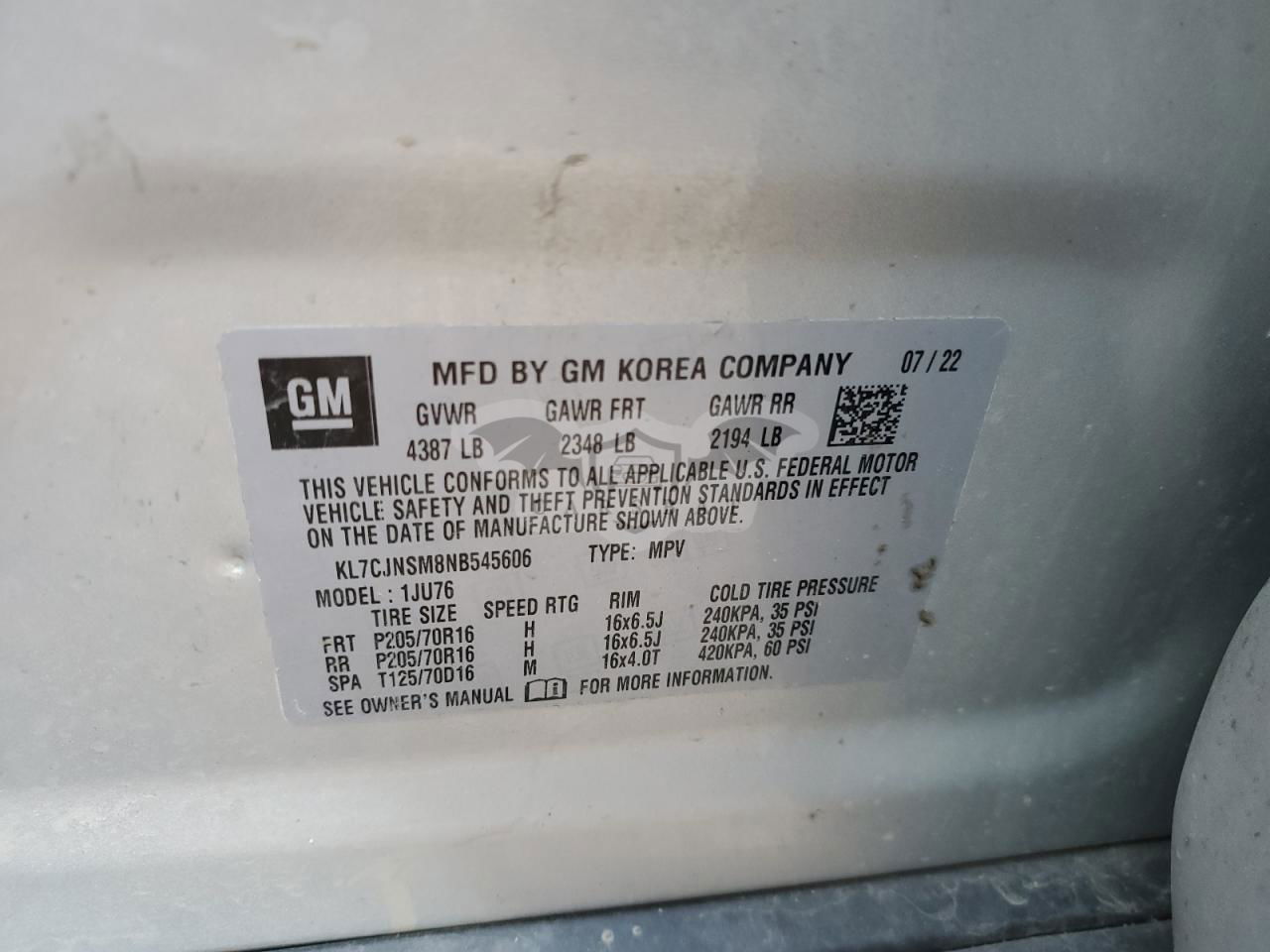 • VIN: KL7CJNSM8NB545606