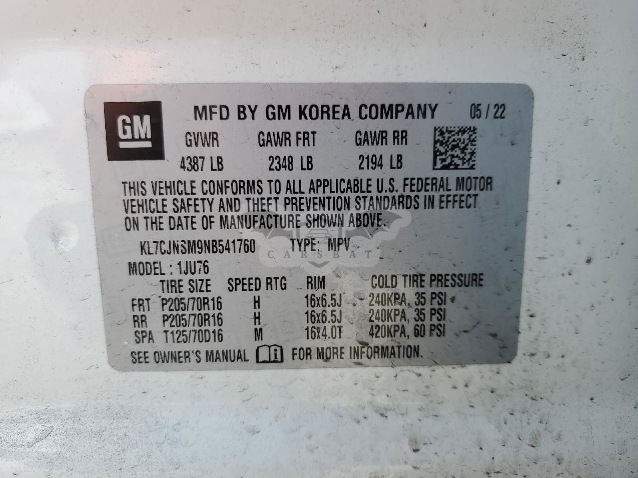 • VIN: KL7CJNSM9NB541760