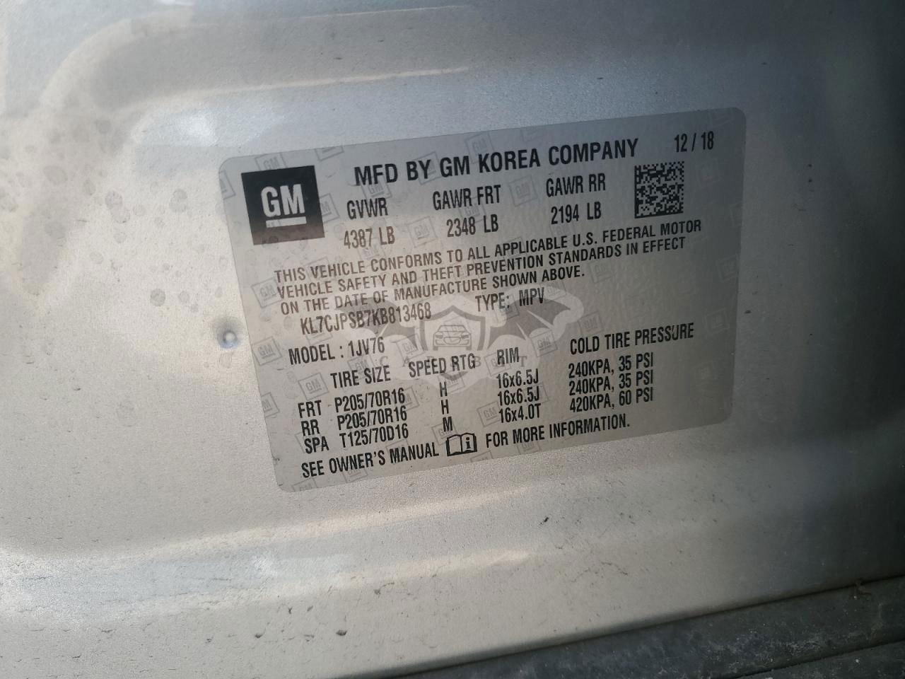 • VIN: KL7CJPSB7KB813468