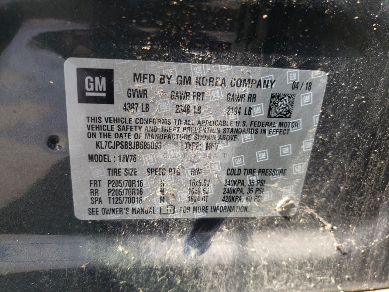 • VIN: KL7CJPSB8JB685093