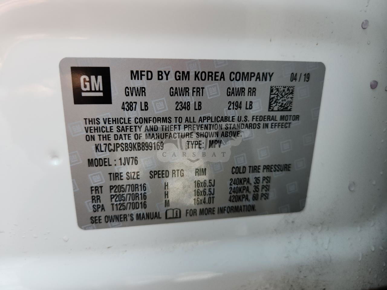 • VIN: KL7CJPSB9KB899169