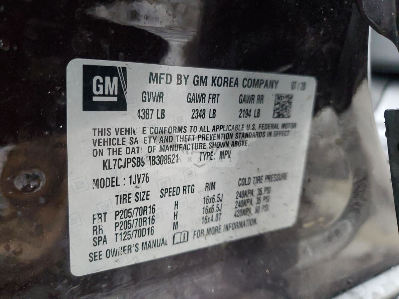 • VIN: KL7CJPSB9MB308521