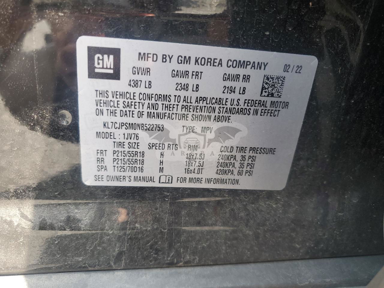 • VIN: KL7CJPSM0NB522753