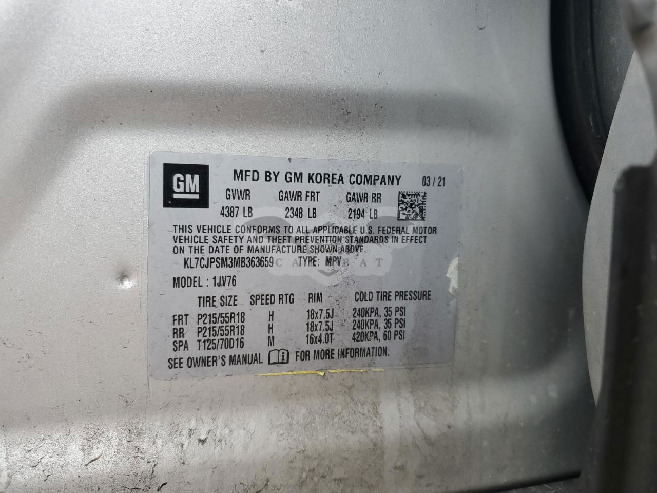 • VIN: KL7CJPSM3MB363659