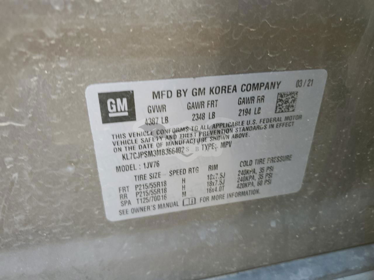 • VIN: KL7CJPSM3MB366402