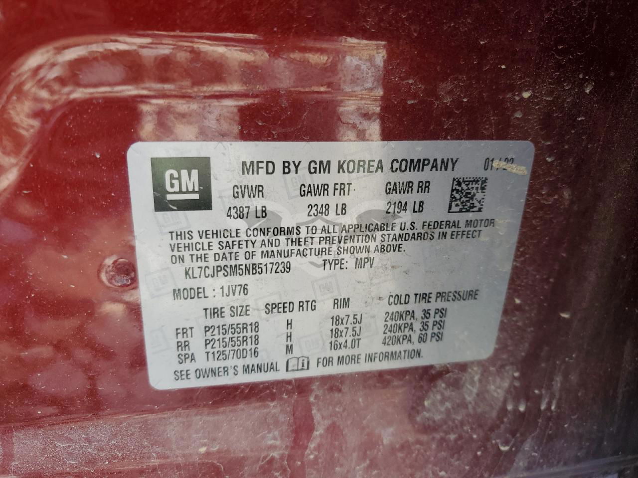 • VIN: KL7CJPSM5NB517239