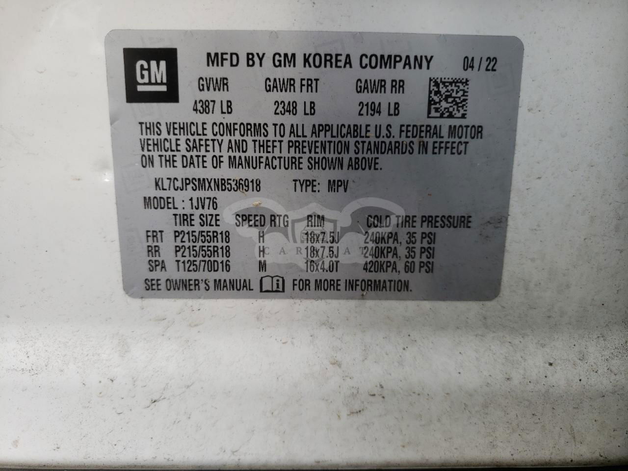 • VIN: KL7CJPSMXNB536918