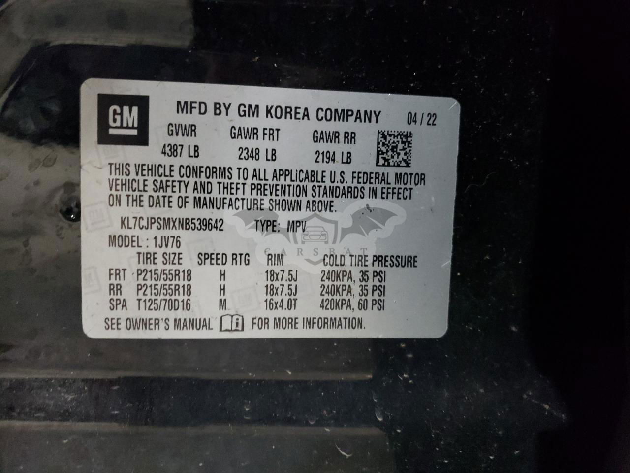 • VIN: KL7CJPSMXNB539642