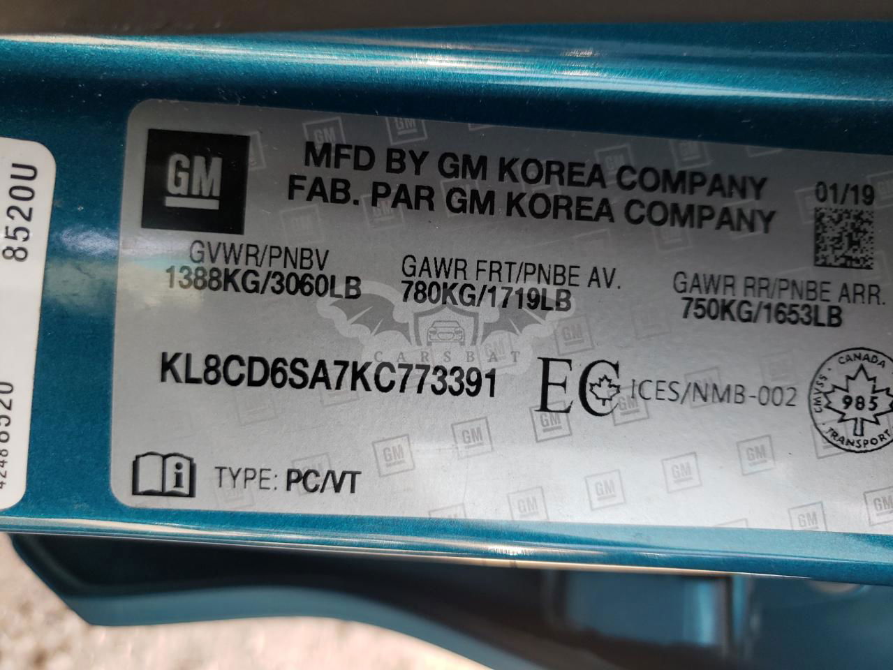 • VIN: KL8CD6SA7KC773391