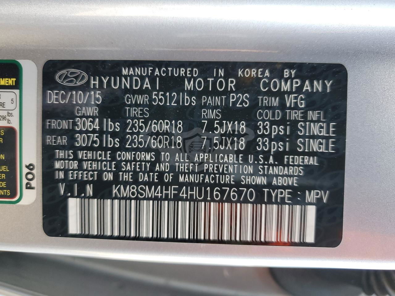 • VIN: KM8SM4HF4HU167670