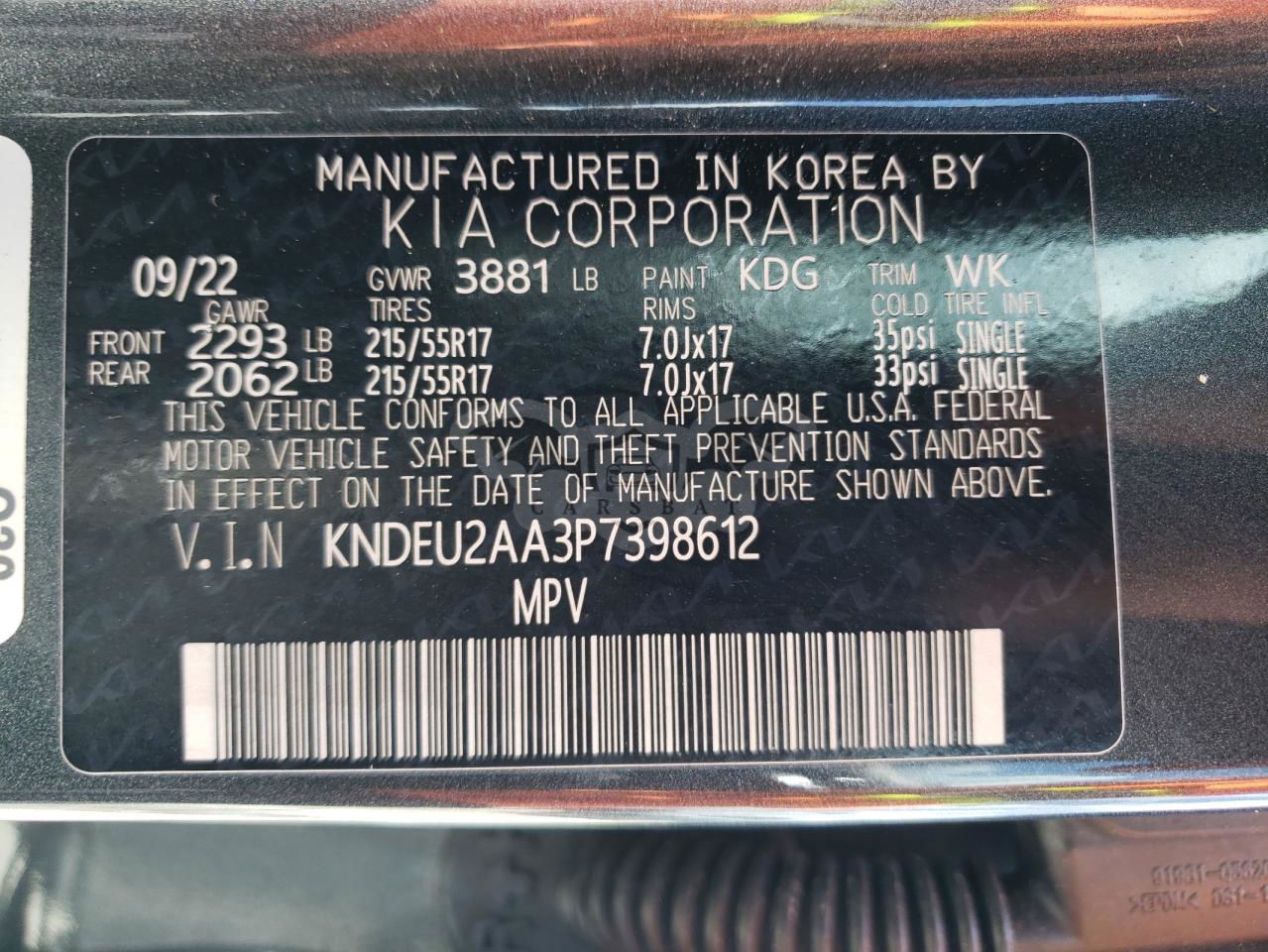 • VIN: KNDEU2AA3P7398612